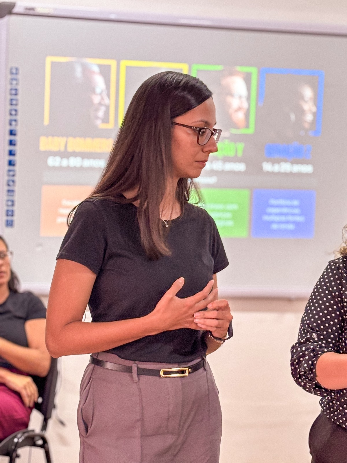 A programação combinou exposição de conteúdo e atividades práticas, incluindo dinâmicas de integração e exercícios em grupo. Entre os destaques estão a dinâmica de apresentação “Timeline Viva”, o “Mapeamento de Gerações” e a atividade “Liderança Adaptativa”, que propõe cenários com diferentes composições geracionais para discussão de estilos de liderança, comunicação e condução de tarefas.
